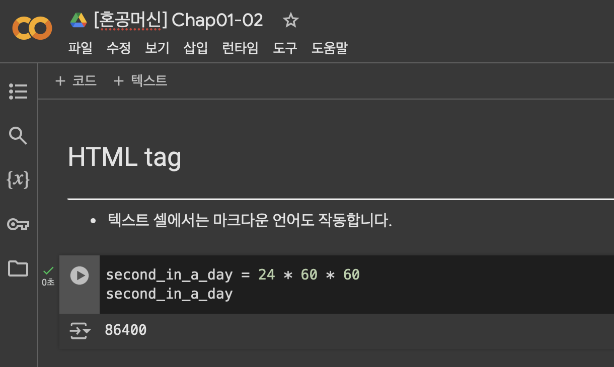 - 텍스트 셀 화면에서는 html언어와 마크다운 언어를 혼용하여 사용 가능합니다.