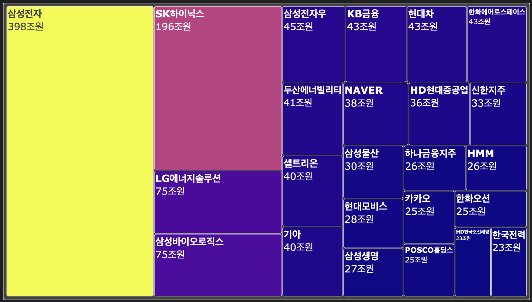texttemplate="<b>%{label}</b><br>%{value:,.0f}조원", # 종목명, 시가총액 표시