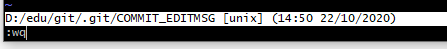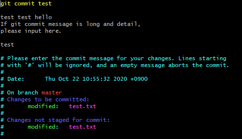 | git commit | commit 생성 긴 commit message를 남겨야 할 경우 자세히 남길 수 있음 *vi editor 종료하기 esc 누르고 : (콜론) w : 저장 q : 나가기 wq : 저장 후 나가기 + Enter |